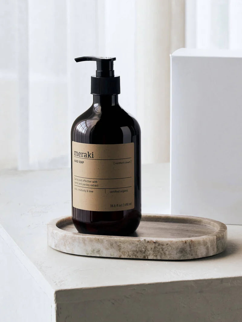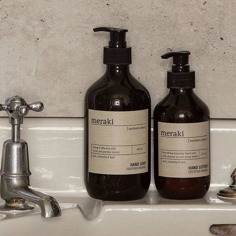 Meraki Hand Soap in the scent Northern Dawn is a luxurious and nourishing liquid soap designed to gently cleanse your hands while leaving them soft, refreshed, and delicately scented. Enriched with organic extracts of carrot and parsley, it provides moisture and care with every wash. The warm and fresh fragrance of Northern Dawn combines notes of orange, cedarwood, and sweet balsamic, creating an uplifting everyday ritual. Housed in a minimalist bottle, it brings both functionality and aesthetic elegance to your sink area. Perfect for daily use and suitable for all skin types.
